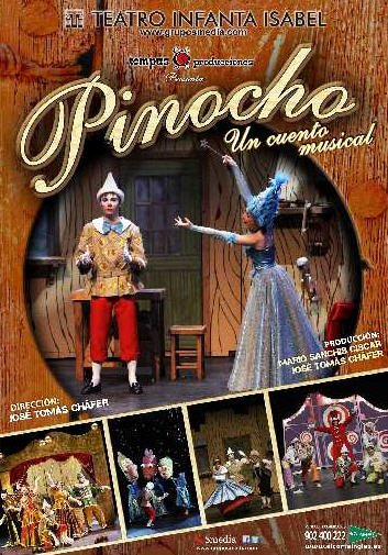 También ha sido adaptada para teatro en diversas versiones, pero ahora José Tomás, actor y director teatral, va un poco más allá en su adaptación del clásico infantil con el título de “Pinocho, un cuento musical”, construyendo un espectáculo teatral en el que intercala nueve canciones originales, con música de Federico Rizzo y letras de Mariano Lloret y con la ayuda de seis actores que se desdoblan en múltiples personajes, pone en escena el conocido cuento en la versión más conocida de la historia.