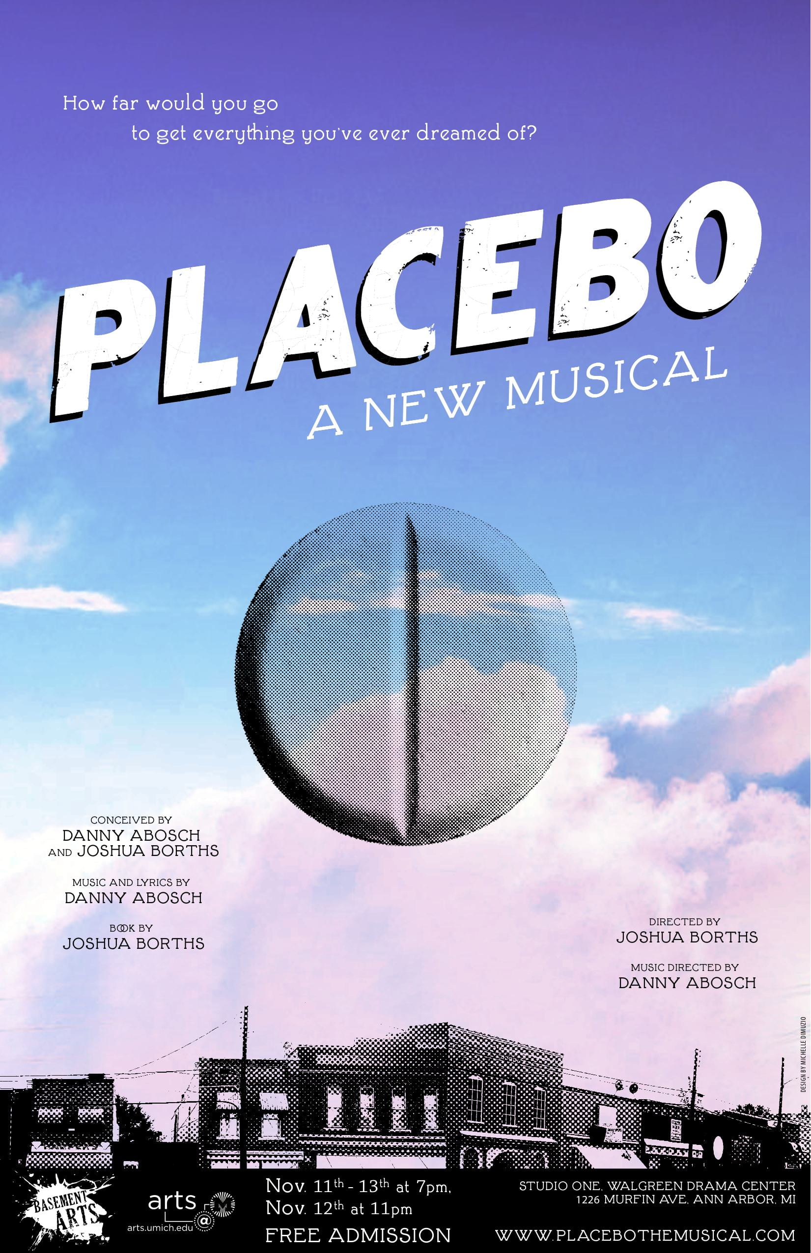 El argumento nos presenta a los hermanos Robert y Blake Wilson que convencen a su pueblo de que tienen una pastilla milagrosa, inventada por su padre, ya fallecido, el científico Dr. Wilson, que puede hacer realidad sus sueños. En realidad dicha píldora no es más que un placebo a base de azúcar, pero la gente cree en los supuestos efectos de la píldora y acepta encantada cada “milagro” que hace realidad la pastilla. El éxito del producto está rebasa todo lo imaginable, pero…. ¿a qué precio?. Placebo es una historia sobre los sueños, y cuestiona la idea de la realidad en un mundo donde lo que no es “real” a menudo parece más prometedor.