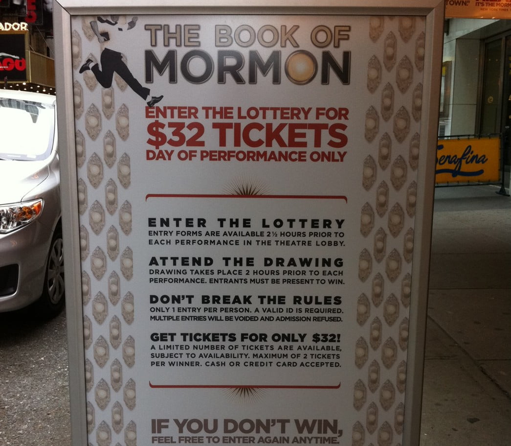 El domingo fue cabezonería y aunque no entraba en mis planes ir a “THE BOOK OF MORMON” por saber que sería cómica y cafre y que no me enteraría de nada, al saber que no había entradas hasta el 20 de Julio y que cada día sortean unas entradas que meten en un bombo, al que puede apuntarse dos horas antes de la función cualquiera, me empeciné y hubo madrugón, cola y entrada. Y tenía razón era más que cómica, descacharrante, era más que cafre, totalmente salvaje, pero con un nivel medio de inglés se pillan los chistes que te hacen aullar y revolverte en la butaca.