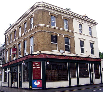 El Landor Theatre es un teatro emplazado en el primer piso del Landor Pub, emplazado en Clapham, al sur de Londres. Se puede ir en metro hasta la parada Clapham North y de allí es fácil siguiendo la Landor Road, hasta el número 70 de la calle. Es un teatro de sólo SESENTA butacas, en tres filas. Vamos, como si te lo hicieran en el comedor de tu casa.
