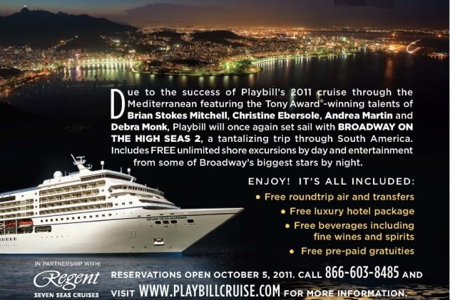 El año pasado PLAYBILL organizó un crucero por el Mediterráneo llamado “BROADWAY ON THE HIGH SEAS 1“, en el que además de visitar varios puntos turísticos como Roma, Pisa, Montecarlo o Venecia, contaban con unos invitados de excepción ya que ganadores del Premio Tony como BRIAN STOKES MITCHELL, ANDREA MARTIN, DEBRA MONK o CHRISTINE EBERSOLE, que ofrecieron recitales de canciones a los pasajeros.