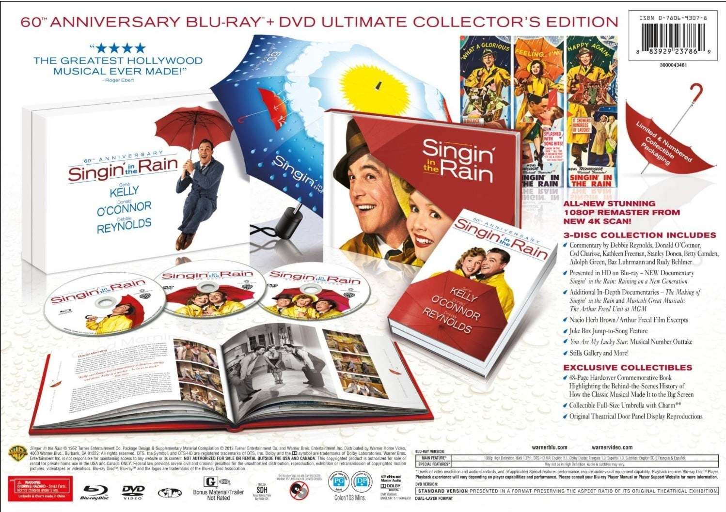 “CANTANDO BAJO LA LLUVIA“, el clásico del musical estrenado en 1952 escrito por Adolph Green y Betty Comden, dirigido por Gene Kelly y Stanley Donen, quje protagonizaron Debbie Reynolds, Gene Kelly, Donald O’Connor y Jean Hagen, anuncia una edición espectacular de TRES DISCOS en Blu-Ray y DVD conmemorando su 60 aniversario, que tiene prevista su salida al mercado para el próximo 17 de Julio de 2012, en el mercado americano y debe haber sido un lanzamiento mundial, que ya está a la venta en nuestro país, pero….