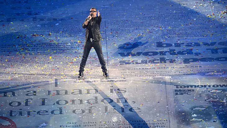 También sonó ¿cómo no? el “Bohemian Rhapsody” de Queen, cantada por otro grupo que el comentarista se atrevió a comentar ¡qué lástima que no la cante Freddie Mercury y qué pena que se muriese y no pudiera estar en Barcelona!. (Qué lastima que no te quedases tú en casa ese día). También aparecieron cantando el “West End girls” Pet Shop Boys, Ed Sheran cantó el “Wish you were here” de Pink Floyd y los chicos de Madness nos cantaron su “Our house”. Ray Davies cantó el “Waterloo Sunset”. No sé si Barry Gibb, último superviviente de los Bee Gees aprobaría lo que hicieron un trío de cantantes con su “You should be dancing”. Luego sonó el “Pinball wizard” de The Who, pero cantada por Kaiser Chiefs que aparecieron montados en motos, que el comentarista explicó que “el cantante está cantando de pie encima de una moto”, menos mal que lo dijo, podíamos pensar que era un fallo de nuestra tele. Posteriormente George Michael salió para cantar “Freedom” y “White light”.