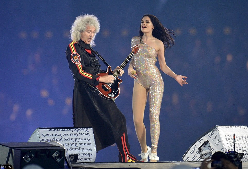 Aparece una pantalla con Freddie Mercury incitando a cantar al personal y los comentaristas otra vez, que si esas imágenes son del concierto de Wembley editado en DVD, que si cuanta fuerza tenía Freddie y más y más y mil, incluso aún hablan cuando aparece Brian May haciendo un espectacular solo de guitarra y dicen que está Roger Taylor, aunque no le vemos hasta que termina el solo May y llega Jessie J para cantar “We will rock you“, poniendo a todo el estadio en pie, acompañando la canción con las palmas, como se encargan de advertirnos los comentaristas.