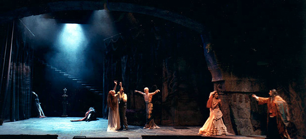 Gruesos cortinajes vestían las paredes laterales del teatro, propinando algún que otro susto a los espectadores, porque a través de ellos, en alguna ocasión aparecían actores de detrás de lo que creías una pared. Todo esto contribuía a mantener el clímax de la obra y es claro que no se podrá exportar a cada teatro de la gira, con todo este detalle.