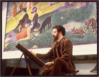 A los personajes del cuadro se uniría el pintor, permitiéndonos conocer la relación personal con su entorno y con el mundo del arte, al que sorprendió con su técnica denominada “puntillismo”, consistente en pintar a base de una sucesión de puntos y no pinceladas, combinando los colores y la luz para que en la retina del ojo humano, a cierta distancia ofreciese el efecto de la imagen buscada.