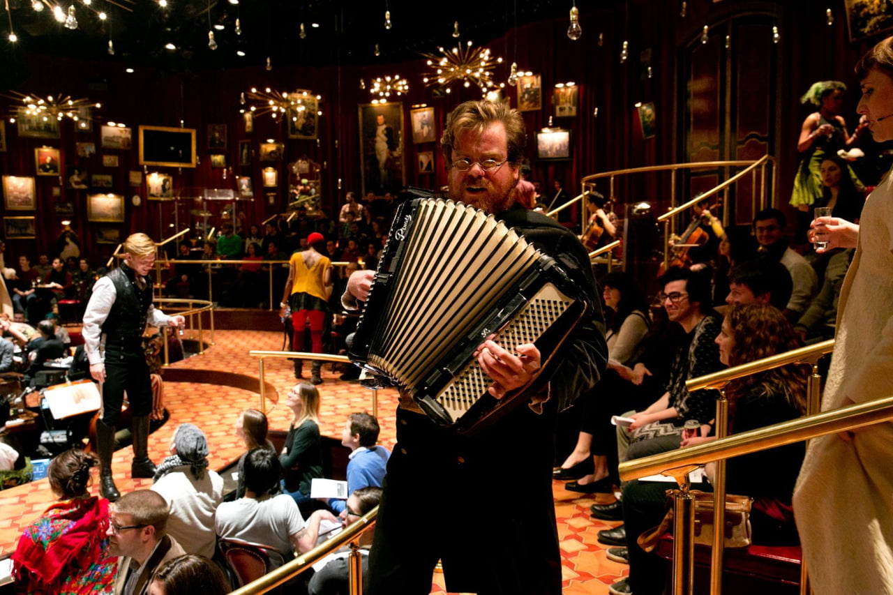 Antes del inicio te advierten que la acción va a tener lugar a tu alrededor, así que quita bolsos y paquetes de los pasillos porque los actores pasarán por cualquier lado. El arranque con el juego de luces y los más de 30 intérpretes de la compañía cantando y bailando entre el público, con armonías vocales de inspiración rusa, impacta al espectador, pero transcurridos quince minutos en los que tienes que girarte hacia atrás para ver o adivinar a un actor, en una plataforma sobre tu cabeza, ya empieza a distraer, incluso molestar y cuando te entregan un cestillo lleno de limones de plástico para que acompañes la música, agitándolos como si fueran maracas te das cuenta de que esto dista mucho de lo que entendemos como obra teatral al uso.
