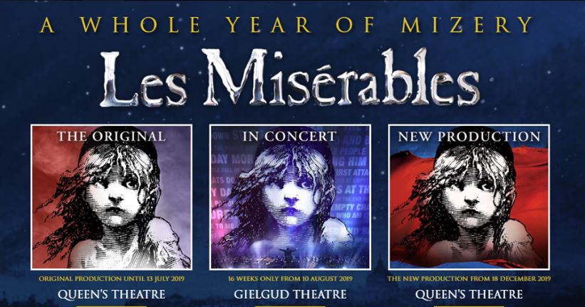 “LOS MISERABLES” se estrenó en el Barbican Center de Londres el 8 de Octubre de 1985. Fue trasladado en Diciembre del mismo año al Palace Theatre donde estuvo hasta Abril de 2004 cuando Andrew Lloyd Webber, propietario del teatro, quiso estrenar allí su musical “THE WOMAN IN WHITE” y no renovó el contrato a los productores de “Les Miserables”, forzándoles a cambiarse al Queens Theatre, un teatro más pequeño, que obligó a readaptar algunas escenas y reducir músicos, ya que no cabían en el foso, con las consiguientes protestas de los fans.
