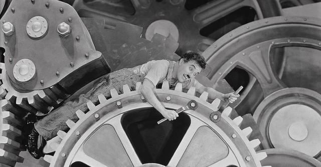 La película tiene momentos realmente brillantes, como el de la implantación de máquina que permite al trabajador comer sin abandonar el puesto de trabajo y continuar rindiendo. Hay otro gag buenísimo en la que muestra el stress que lleva el trabajo en cadena apretando tornillos incansablemente. Chaplin es un genio que escribe el guion y la música de la película que protagoniza, produce y dirige.