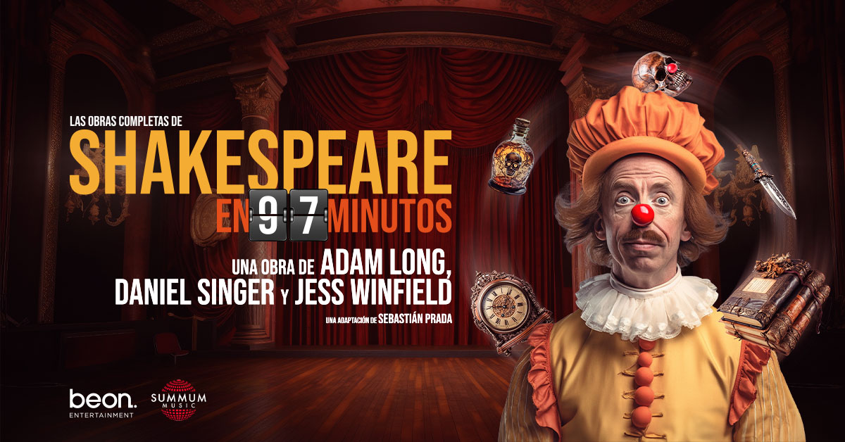 “Shakespeare en 97 minutos” es la adaptación española de “The complete works of William Shakespeare (abridged)”, que promete ofrecer una versión abreviada de las 37 obras del mundialmente famoso autor inglés, en tan solo 97 minutos, interpretadas po tres únicos actores para dar vida a todos los personajes masculinos y femeninos de la obra, como en los tiempos del bardo.