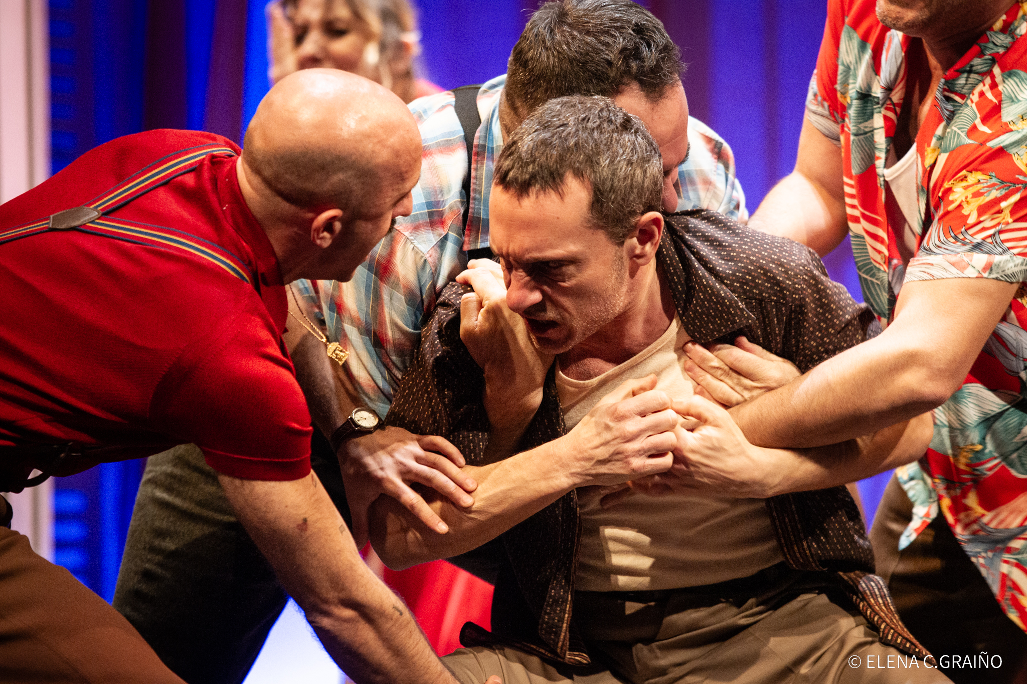 Pablo Derqui es un Kowalski menos sucio y sudoroso que Brando, pero tan dominante, directo y agresivo como demanda su personaje. Se sabe el amo de la casa y lo recuerda constantemente. Impactante su escena reclamando el perdón de su esposa entre sollozos. María Vázquez es Estella, enamorada de su marido que debe mediar entre él y su caprichosa hermana para que todo se sostenga. Jorge Usón es ese hombretón educado, ligado todavía a su madre, capaz de sugerir ternura y miedo a la vez. Aunque todo el reparto está muy bien, debía remarcar estos cuatro actores que dan todo un recital interpretativo.